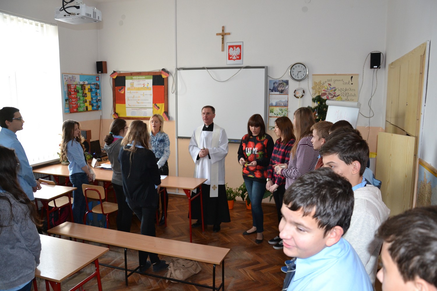 Aby nawiązać do tej tradycji nasz katecheta ks. K. Chechelski udał się z kolędą 7 stycznia, na godzinie wychowawczej, do wszystkich klas w naszej szkole, życząc podczas wizyty duszpasterskiej wszystkim uczniom oraz wychowawcom Bożego błogosławieństwa. Uczniowie danej klasy zaśpiewali wspólnie wybraną kolędę. Ponadto zostały poświęcone sale lekcyjne, biblioteka, pokój nauczycielski, pokój ks. dyrektora, pokój p. księgowej oraz szkolny sklepik, a dziewczyny z 2LO rozdały wszystkim obrazki kolędowe na pamiątkę tego wydarzenia.
