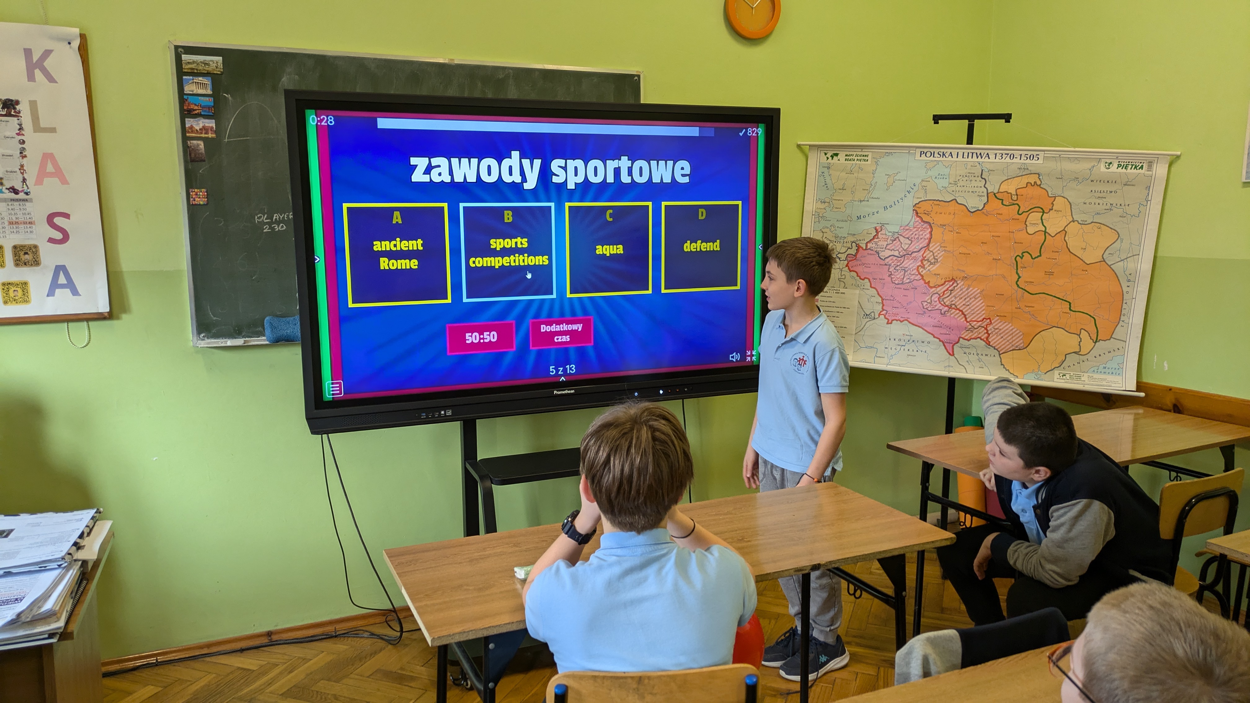 Zintegrowane kształcenie przedmiotowo-językowe (CLIL) to podejście, w którym dzieci uczą się jednocześnie przedmiotu i drugiego języka. Nasza szkoła stawia na nieustające poszukiwanie nowoczesnych metod nauczania, które uczynią z naszych uczniów obywateli świata, posługujących się biegle językami obcymi. Dzięki mobilności edukacyjnej nauczycieli, w ramach realizacji projektu „Europejscy, elokwentni, ekologiczni”, finansowanego przez Fundusze Europejskie dla Rozwoju Społecznego 2021-2027, metoda CLIL została zastosowana na lekcjach matematyki, historii oraz wychowania fizycznego.Uczniowie z ogromnym zaangażowaniem, radością i motywacją podeszli do tych zajęć.